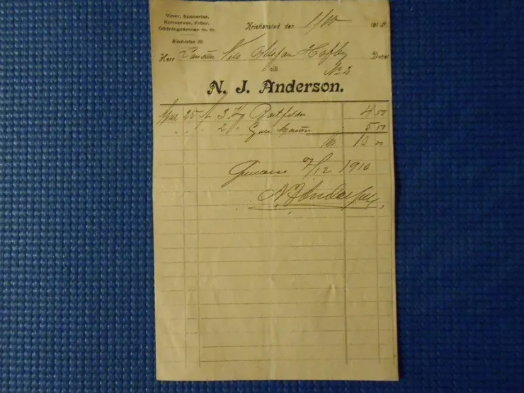 Tradera Kvitto N J Anderson Kristianstad 1910> Fragtsedler & Fakturaer