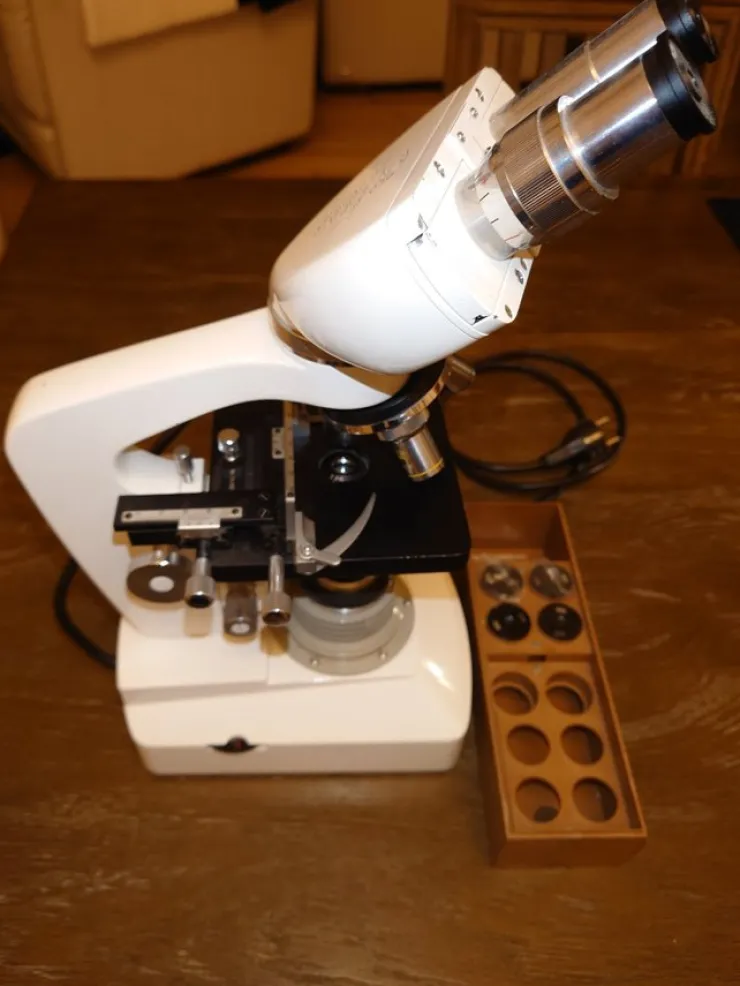 Kyowa Tokyo mikroskop, model L8B-3AC, serienummer 765267. Specielt fremstillet til Selefa. Indeholder et udvalg af objektiver. I alt tre forskellige par objektiver.