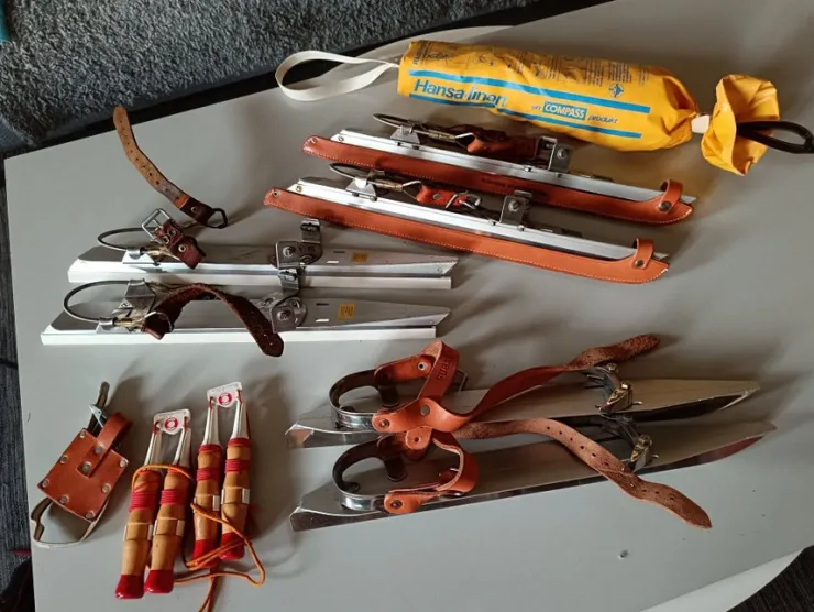 Totalt tre par långfärdsskridskor i lättmetall varav två med originallåda.