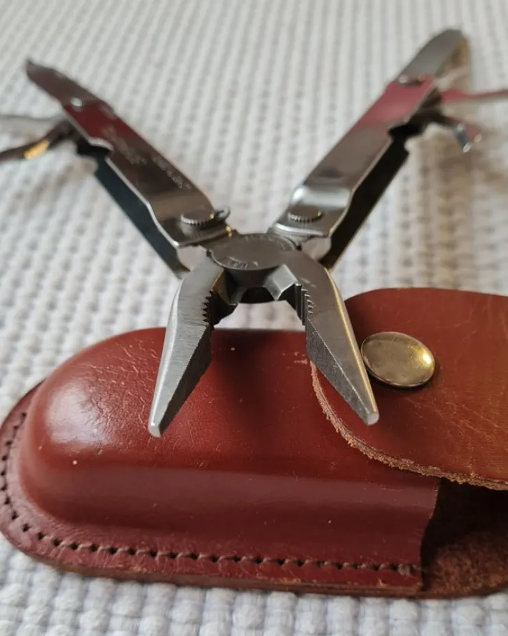 Multiverktyg Leatherman Tool Portland OR USA, i brunt omärkt läderfodral.
