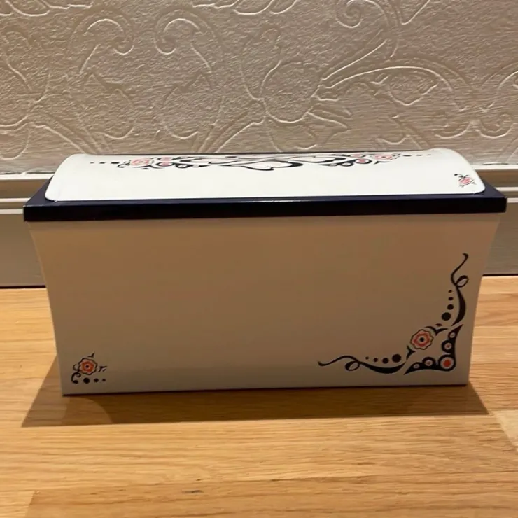 Fin plåtburk från Lekands Knäckebröd med dekorativ design. Perfekt för förvaring av diverse småsaker eller som retro inredningsdetalj eller förvara Leksands trekantsbröd.