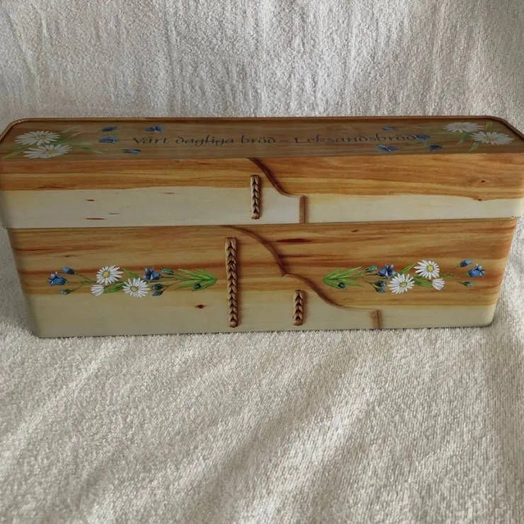 Lekands Knäckebröd plåtburk med texten ”Vårt dagliga bröd – Leksandsbröd”.
