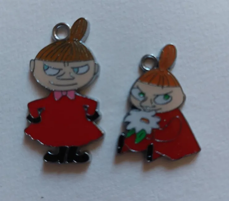 Två söta Mumin-berlocker föreställande Lilla My. Perfekta att använda i smyckestillverkning eller som dekoration.