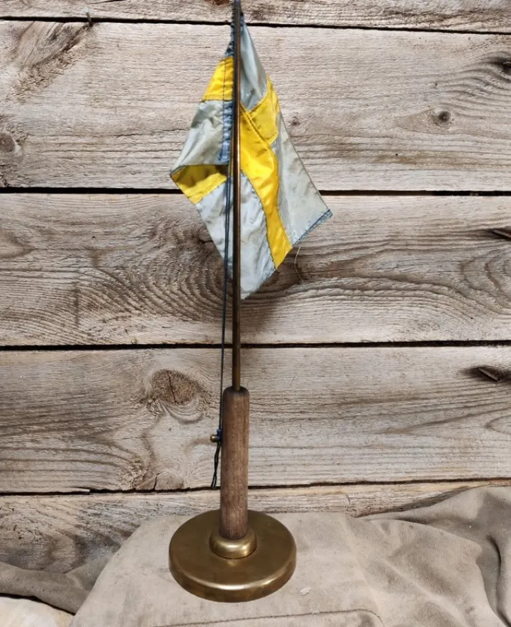 Lite ovanlig bordsflagga med stång i mässing och trä. Flaggan lite blekt. Höjd ca 38 cm (ovanligt kort jämfört med de flesta).