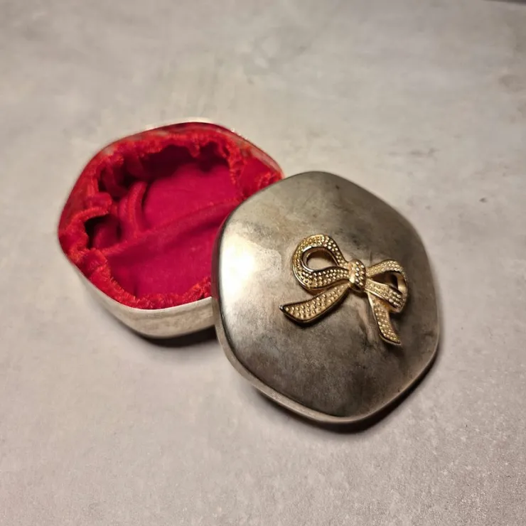 Fin liten gullig, äldre smyckesask i metall med rosett i guldfärg med röd insida.
