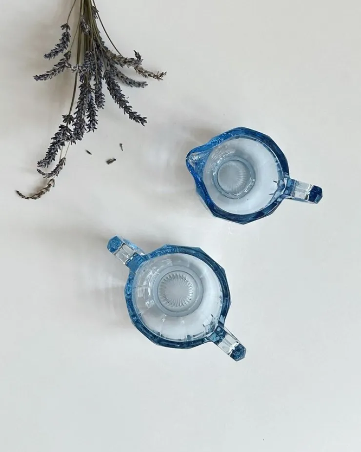 Et sukker- og flødesæt i kraftigt, lyseblåt glas