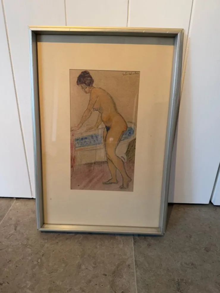 Målning föreställande en badande kvinna. Konstverket är inramat, med glas.