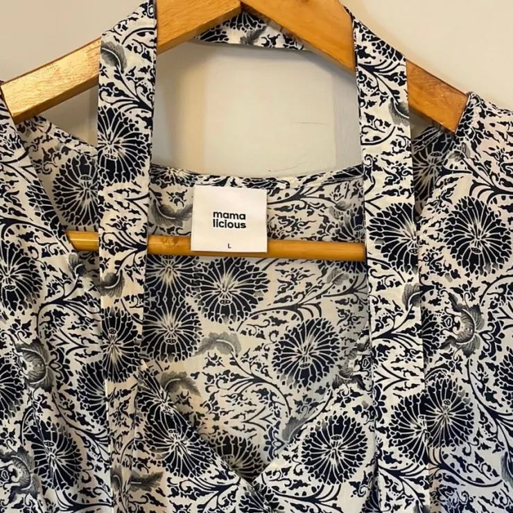 En klänning med ett mönster i blått och vitt. Klänningen har en v-ringning, resår under bysten samt ett löst skärp till.