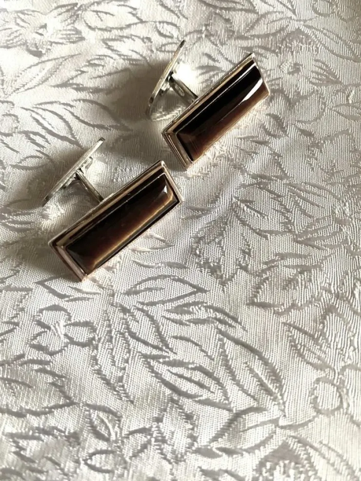 Manschettknappar i äkta silver, med tigeröga. Förgylld ram runt stenen.