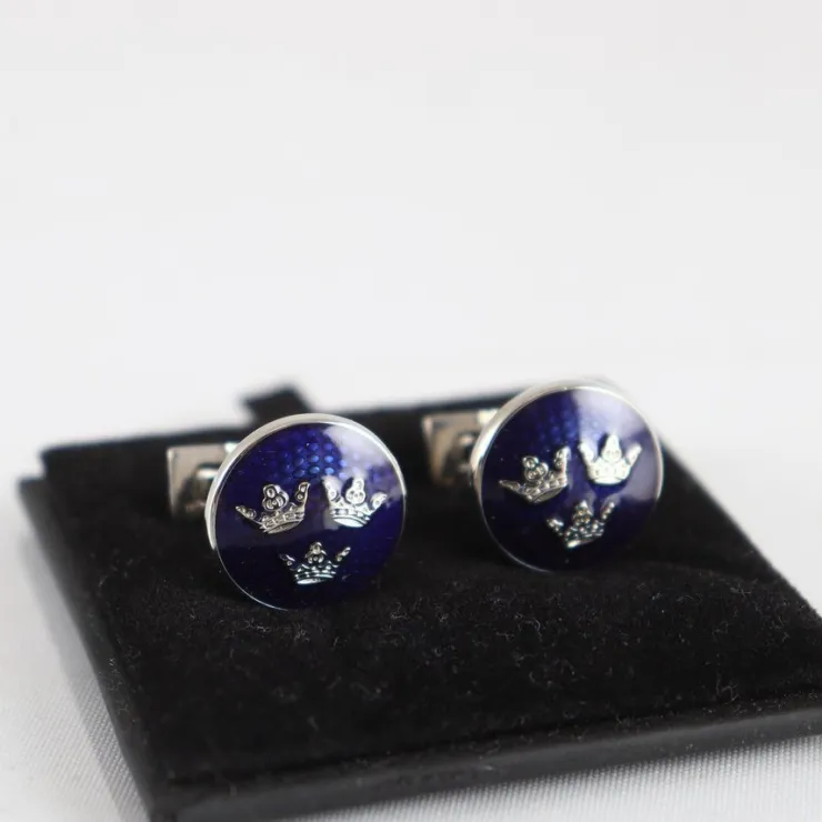 Tradera Manschettknappar, silverpläterad mässing, emalj, Tre kronor, Skultuna> Manchetknapper