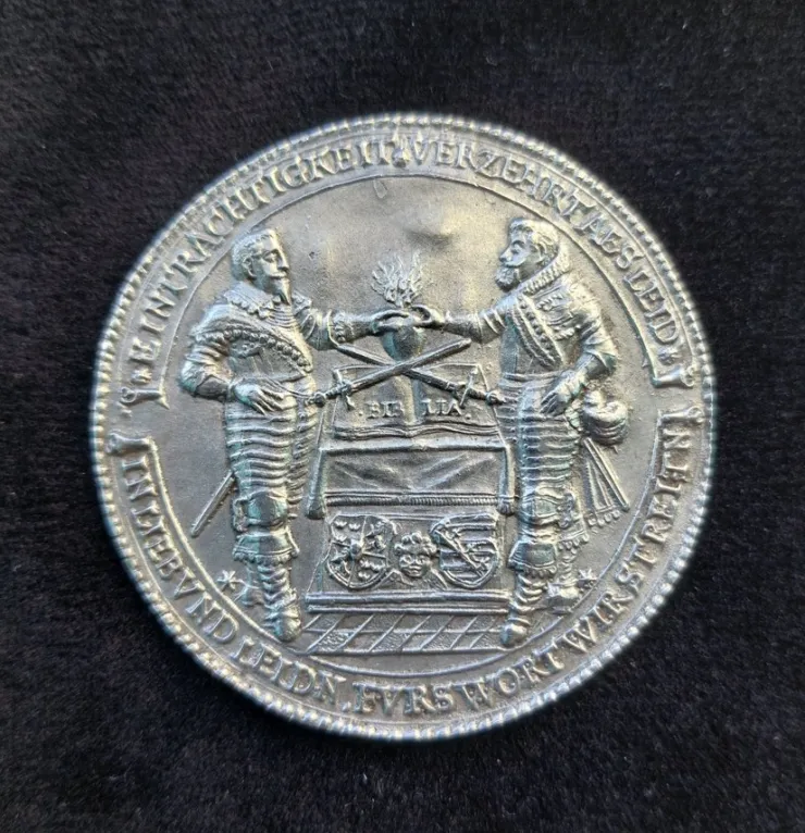 Stor och detaljerad medalj föreställande två kungar i ett förbund. Medaljens framsida visar de två kungarna som sluter ett avtal. Baksidan innehåller en inskription: "CHVR SACHSSEN AVCH KONIG ZV SCHWEDEN DVRCH GOTTES CRAFT VNS RETTEN AVS NOTHN". Årtal eller värde anges inte på medaljen.