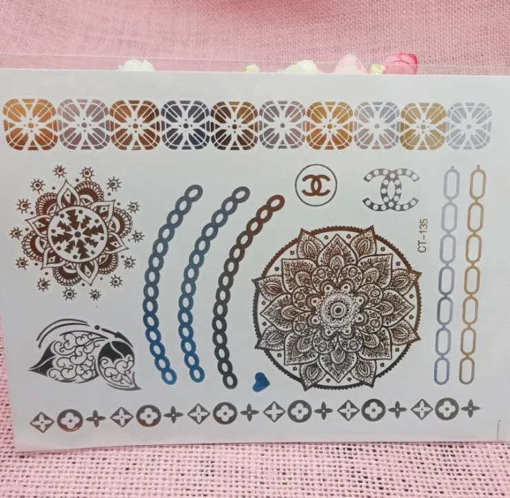 På varje ark medföljer ett flertal tatueringar som enkelt kan appliceras på huden.