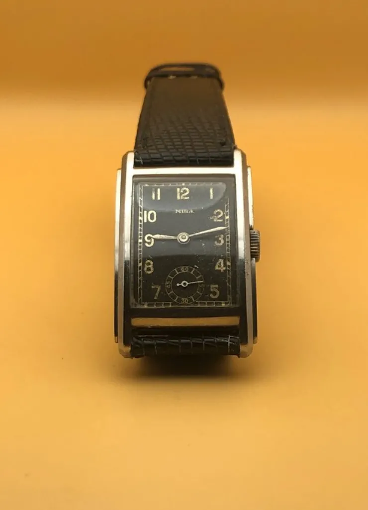 Miba herreur. Swiss Vintage fra 1940’erne. I god stand. Uret har brugsspor, men der er ikke mange nævneværdige ridser på hverken glas eller kasse. Den sorte urskive med gyldne tal og visere bærer præg af tidens gang – dog mest omkring kl. 1. Bagkassen har indgraveret teksten: P. Langhoff, Silkeborg, 1944. Swiss Made manuelt mekanisk urværk, som fungerer og tikker fint. Uret sidder på en sort rem i læder og en for mig ukendt form for skind. Det måler 25mm uden krone og 37mm med horn.