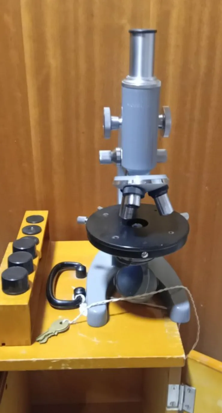Mikroskop med tilbehør og tilhørende træopbevaring med lås.