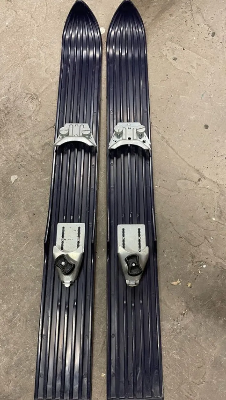 Miniskidor med bindningar och stålkanter.