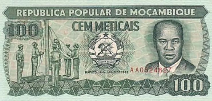 100 Meticais seddel fra Republikken Mozambique. Sedelen er fra år 1989 og har serienummer A A2425860