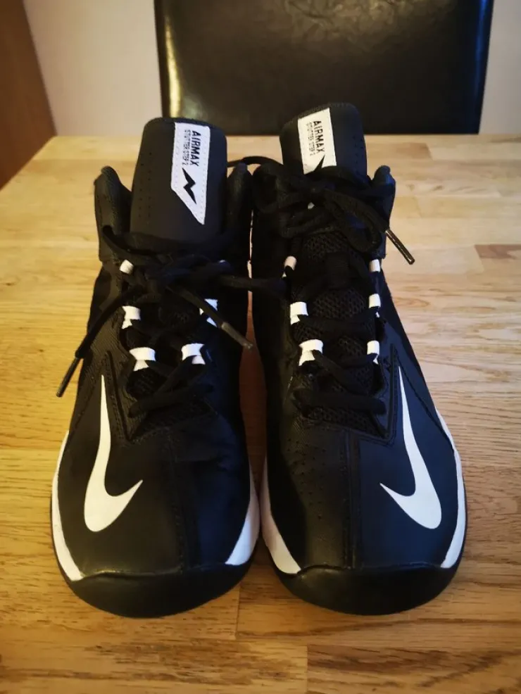 Snygga Nike Air Max basketbollskor i svart med vita detaljer. Skorna är i bra skick och redo för nya äventyr på planen. Perfekta för både träning och vardagsbruk.
