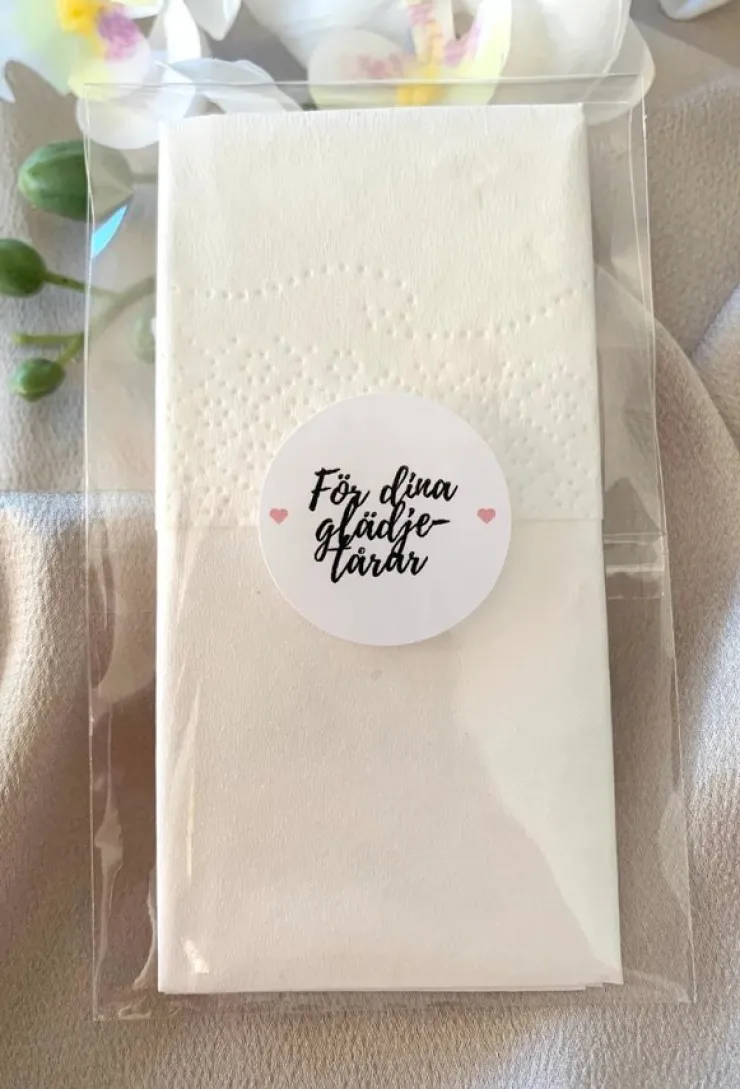 75 st näsdukar i cellofanpåse med klistermärke ”För dina glädjetårar”, perfekt att ge till gästerna på bröllop, till festen mm.