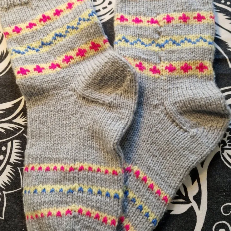 Nya Handstickade strumpor i grått med färgglada ränder. Strumporna är stickade i ett fint mönster med blått, gult och rosa.
