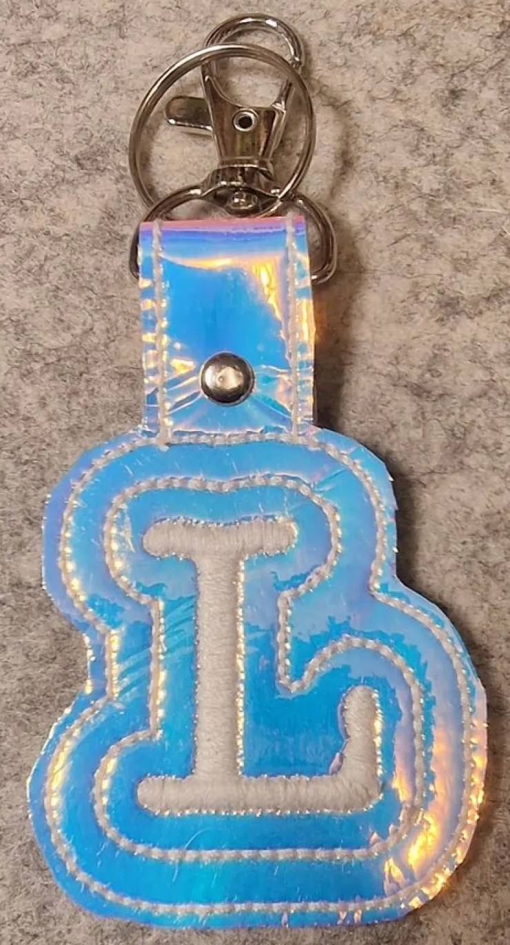 Snygg nyckelring med bokstaven L i vitt på en blank bakgrund. Perfekt för att markera dina nycklar, hänga på väska/kläder eller som en liten present.