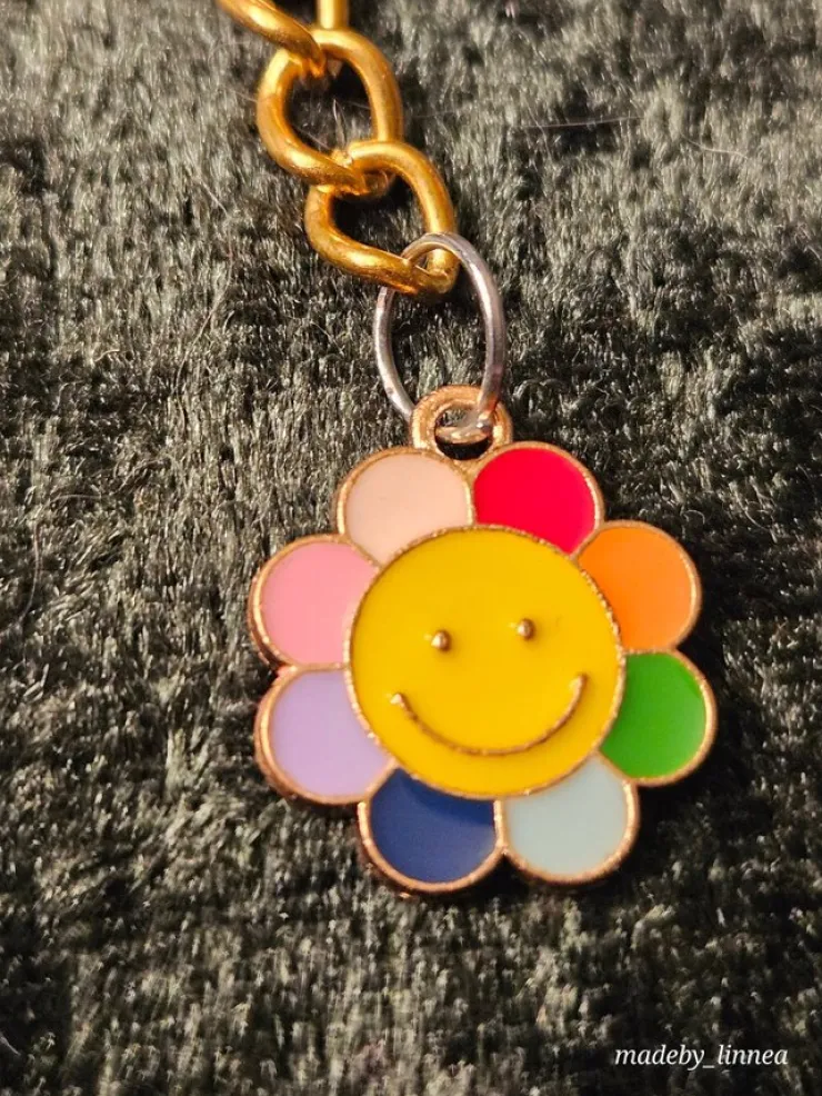 Söt nyckelring formad som en glad solblomma med regnbågsfärgade kronblad. Perfekt som liten detalj till nycklar eller väska.