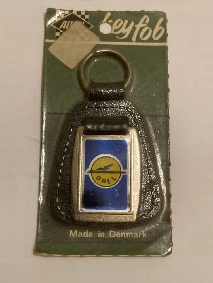 Oöppnad Opel nyckelring för veteranbilen. Tillverkad i Danmark och priset var 1,35 kr. Från 1960-talet. Mått exkl. ögla ca 5×4 cm.