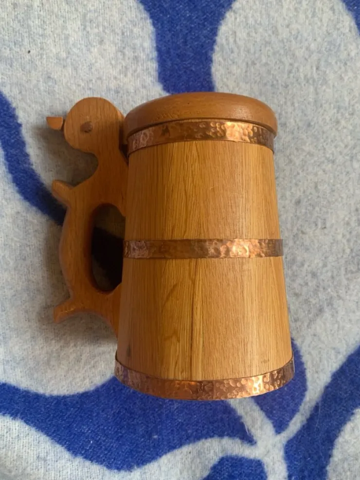 Ölsejdel i trä är dekorerad med band av hamrat koppar. Perfekt för samlare eller som en unik present.