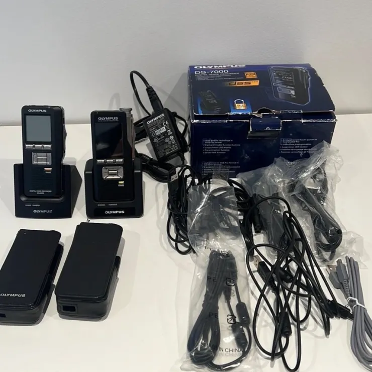 Två Olympus DS-7000 digitala diktafoner säljes. Diktafonerna är kompatibla med både Windows och Macintosh. De har fyra funktionsknappar och ett metallhölje. Olympus Dictation Management System ingår. Medföljer även tillbehör.