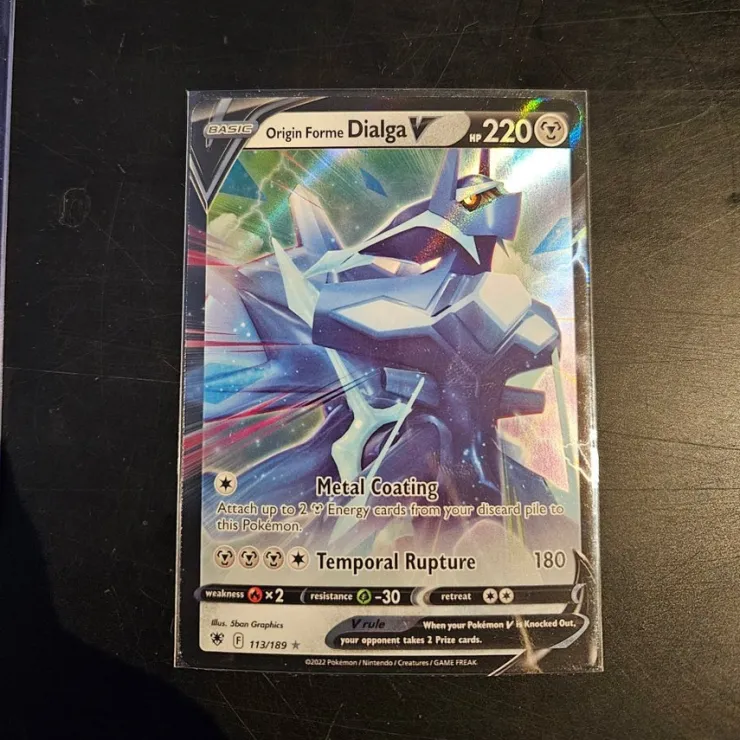 Origin Forme Dialga V Pokémonkort. Ett kraftfullt kort med höga HP och bra attacker. Perfekt för att stärka din Pokémon-samling!
