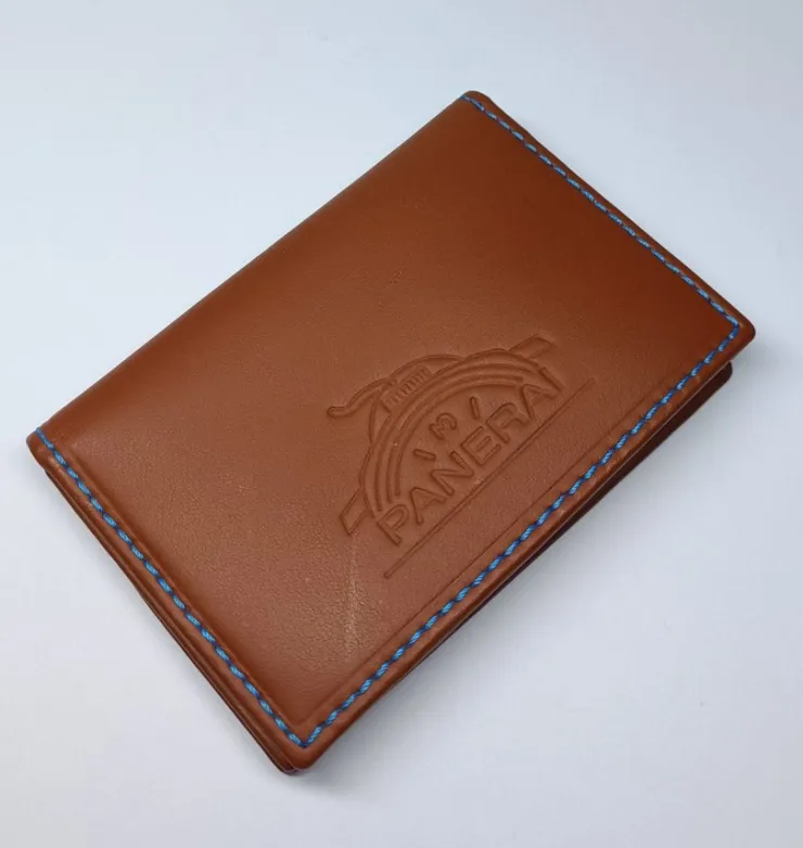 En elegant Panerai tegnebog i brunt læder med blå syninger som vist på billederne.
