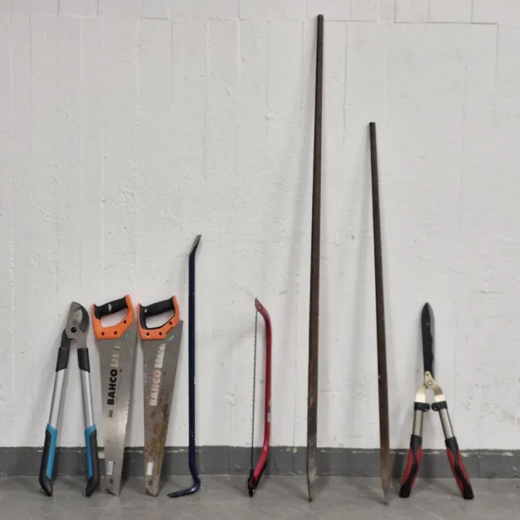 Parti verktyg – Handsåg, kofot, järnspett & grensax, mm – Brytjärn – Redskap