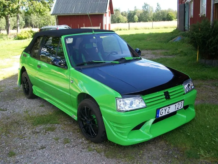 Peugeot 205 Cabriolet med sort kaleche. Bilen er udstyret med sportssæder, et kraftigt lydsystem og en stor subwoofer. Bilen har også et digitalt ur og en moderne stereo. Bilen har kørt 159864 km.