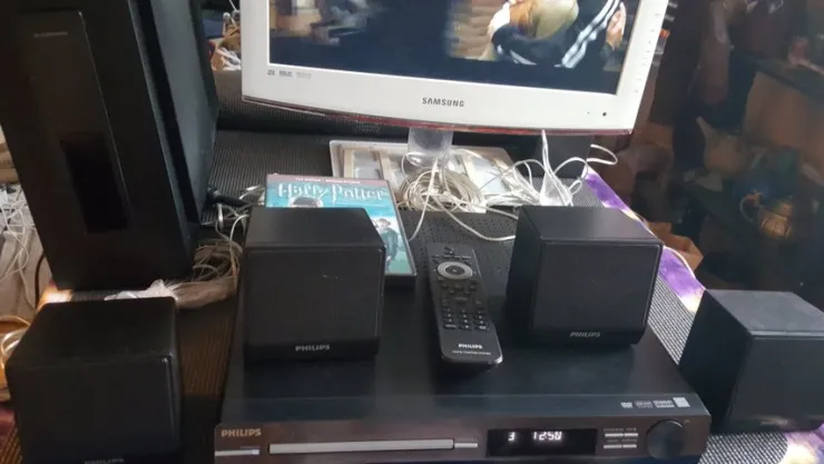 Philips hemmabiosystem med 5.1 surroundljud. Inkluderar en DVD-spelare, en subwoofer och fyra satellit-högtalare. Systemet har en inbyggd Dolby Digital-dekoder och stöd för DVD-Audio och SACD. Det finns även en USB-port för att spela upp musik från en USB-enhet. Systemet är i gott skick och fungerar perfekt.
