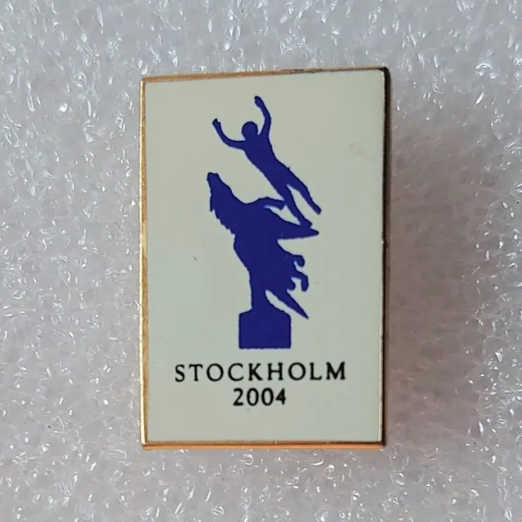 Pin: Metallmärke för OS-ansökan Stockholm 2004 – vit bakgrund