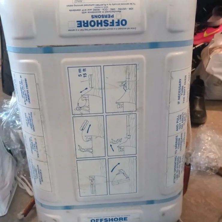 En Plastimo Offshore Flotationsutrustning. Den är vit och har en blå rand runt om. Den har en text på sig som säger "Offshore Personnes" och "5m 15ft". Den har också en bild av en båt som är i vattnet.