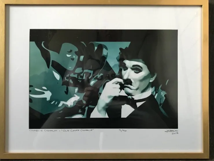’Charlie Chaplin – Old Chap Charlie’ av Lord Lazze Xerxes Eventhén (f. 1959). Fotografi/Digital målning/PopArt. Photoprint. Upplaga om 50 st exemplar, numrerad 3/50. Bildmått 20 x 30 cm, träram, rammått 31,5 x 42 cm. Betitlad och numrerad. Signerad av Lazze X.