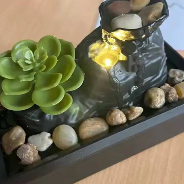 Vacker och avkopplande vattenfontän med flera nivåer och LED-belysning. Drivs med USB-kabel eller batterier (ingår ej). Perfekt som dekoration i hemmet eller på kontoret. Levereras med stenar. Endast öppnad för att ta bilder och testas så den funkar. Annars är den helt ny och oanvänd