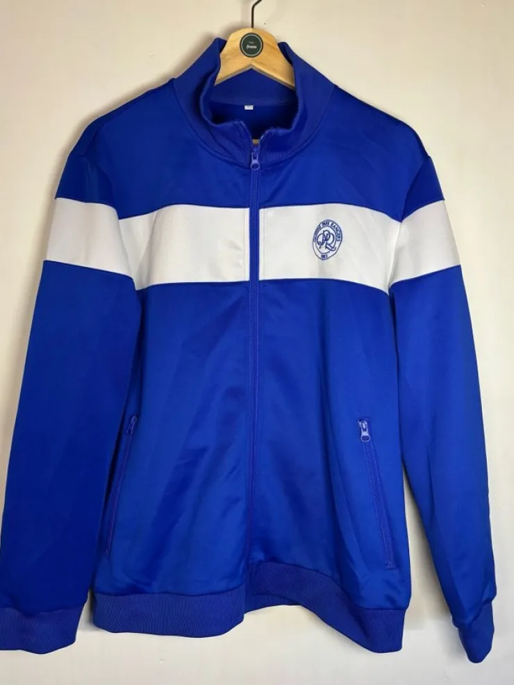 Snygg och retroinspirerad träningsjacka i blått och vitt med Queens Park Rangers logotyp.