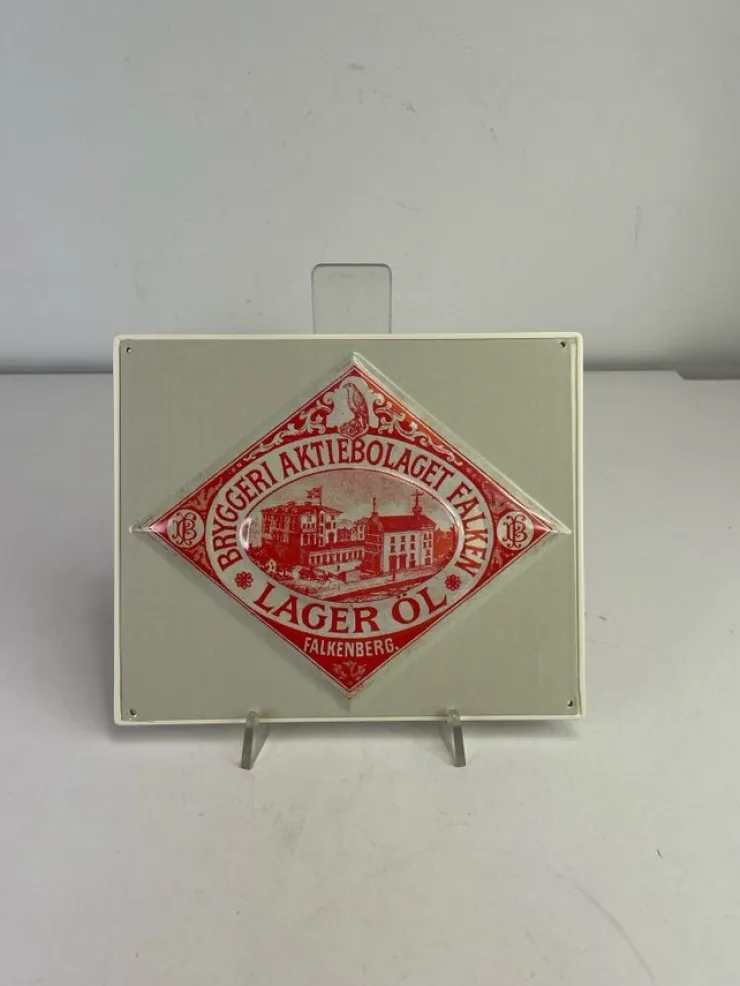 En äldre reklamskylt ” Bryggeri Aktiebolaget Falken, Lager Öl ”.