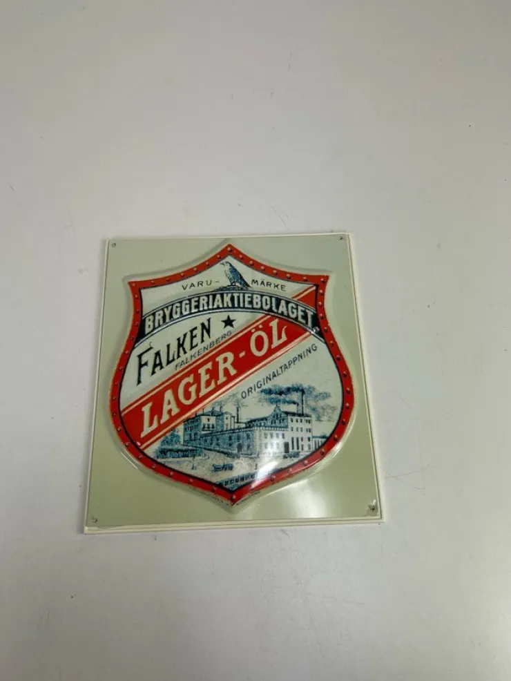 En äldre reklamskylt för ” Falken Lager-Öl ”.