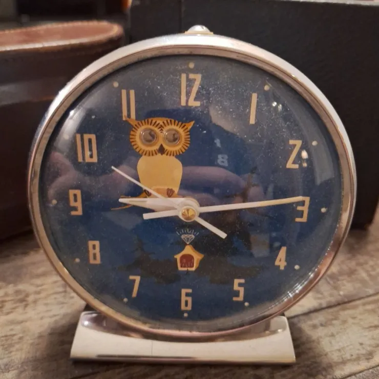 Söt och retro klocka med motiv av en uggla. Klockan är i metall med en blå urtavla. Klockans mekaniska verk fungerar, men jag kan inte garantera dess precision. Den är i begagnat skick med tecken på slitage, men i övrigt i gott skick. Perfekt som inredningsdetalj eller present. Ugglans ögon rör sig i sidled i sekundfart. Detta var min väckarklocka när jag var liten på 70 talet. Kinestillverkad och fungerar.