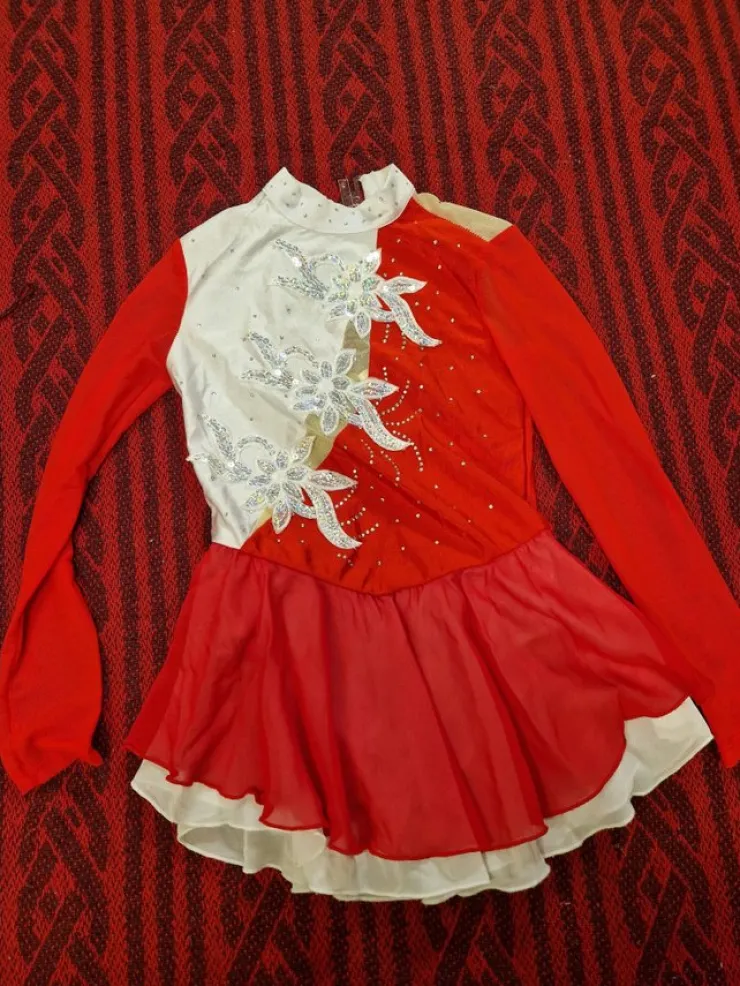 Vacker konståkningsklänning i röd och vit. Klänningen har långa ärmar och en fin dekor med paljetter och detaljer. Den har ett lager av tyll under kjolen för extra volym. Perfekt för tävling eller träning.Vacker konståkningsklänning i vitt och svart med spetsdetaljer. Klänningen har en hög krage och långa ärmar i spets. Den är dekorerad med glittrande stenar. Klänningen har en asymmetrisk design med en svart spetsdetalj på ena sidan. Perfekt för tävling eller träning.Vacker svartvit klänning med spetsärmar. Klänningen är dekorerad med strass.