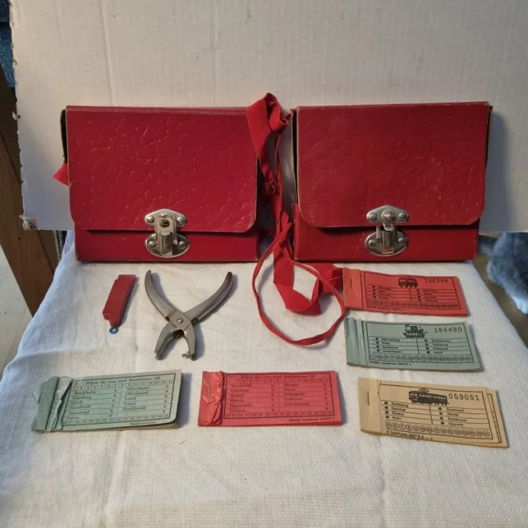 Två stycken äldre konduktörsväskor – leksak! – med 1 st biljettång – 1 visselpipa – 5 häften med biljetter, varav 2 av dem har få biljetter kvar.