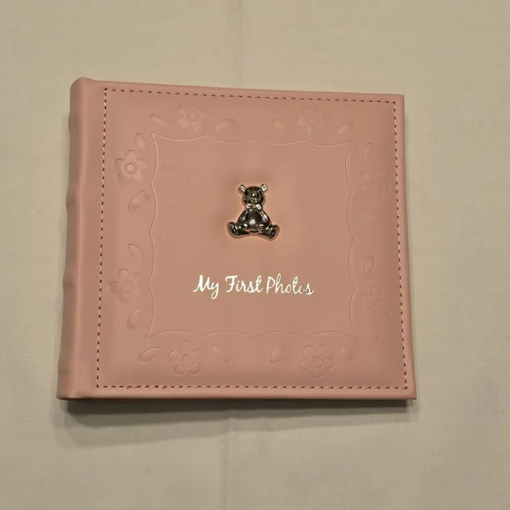 Sød lyserød fotoalbum perfekt til at gemme barnets første billeder. Albumet har et flot design med blomster og en lille bamse på forsiden. Indeni er der beskyttende plastlommer til billederne. Albumet er ubrugt.