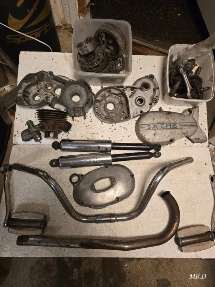 Reservedele til Sachs 50cc knallert. Dele inkluderer motorblok, krumtapkasse, karburator, støddæmpere, udstødningssystem og diverse andre komponenter. Markering: Fichtel & Sachs A.G., Type Sachs 50. Motornummer: 1841306. Se billeder for detaljer.