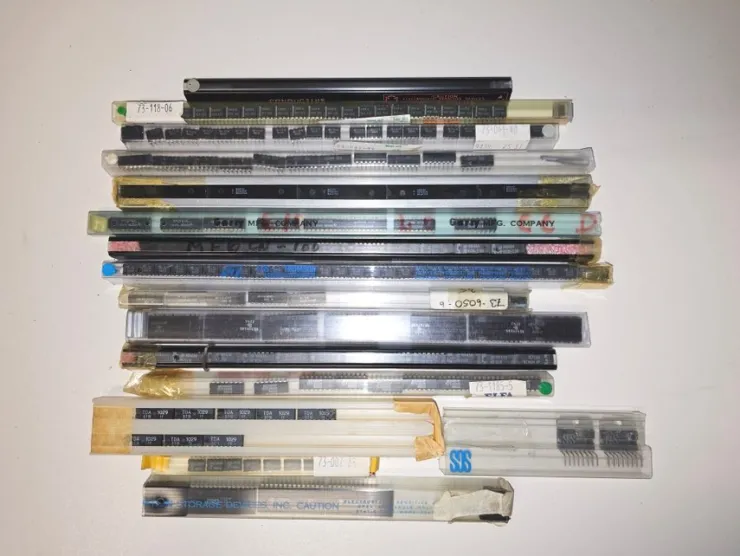 En stor samling integrerade kretsar (IC-kretsar) i olika storlekar och märken. Bilderna visar detaljerna. Säljes som ett parti. Allt är nytt i förpackning