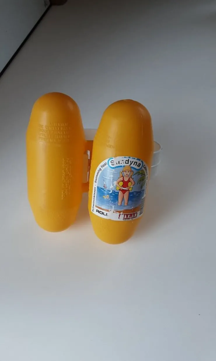 En traditionell gul floater placerad runt midjan hjälper barnet att lära sig simma .