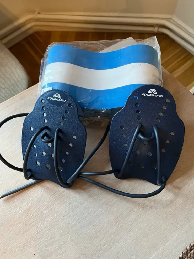 Säljer ett set simpaddlar från märket Aquarapid och en pull boy. Simpaddlarna är mörkblå med svarta band. Pullboyen är blå och vit. Perfekt för simträning!