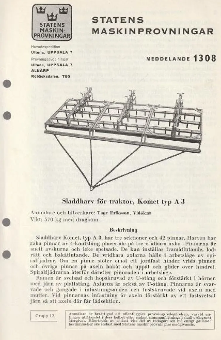 Tradera Sladdharv Komet A 3 test statens maskinprovningar| Landbrugsmaskiner