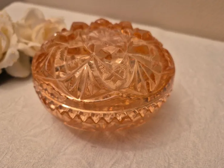 Tradera Smyckesask, lockask nipperask bonbonjär pressglas,aprikos.> Smykketilbehør